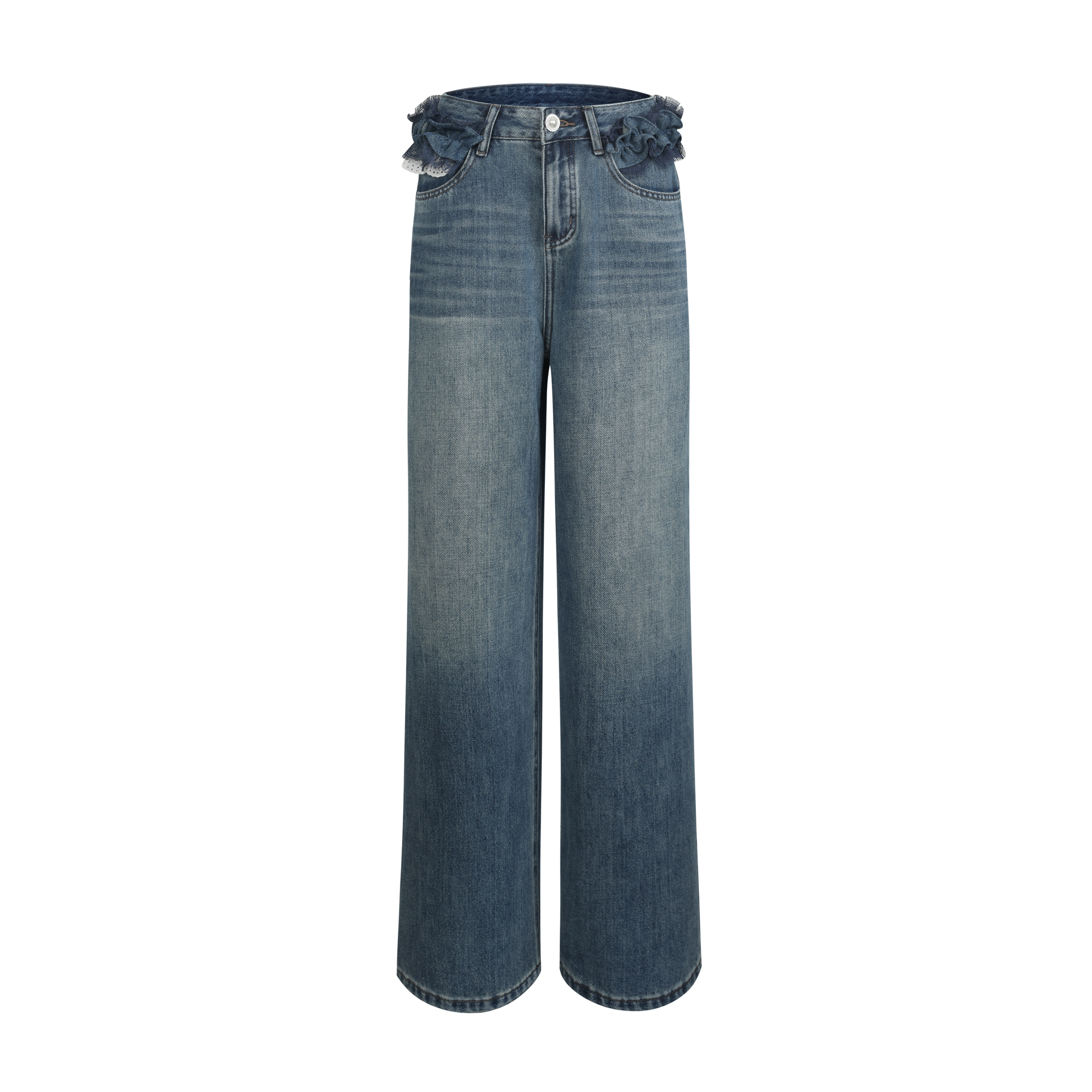 Blue Asymmetrical Lace Wide-Leg Denim Pants